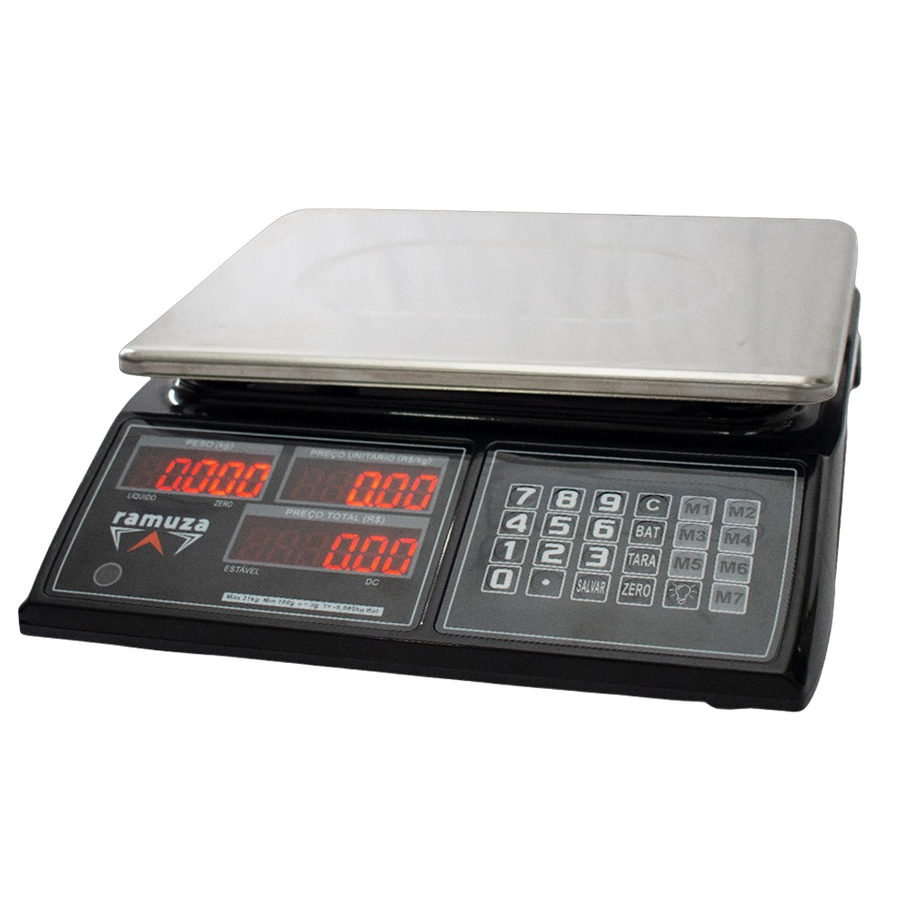 A balança Ramuza Led DCRL M7 é uma solução moderna e eficiente para pesagem e cálculo de preços em estabelecimentos varejistas, como supermercados, padarias, açougues e feiras. Com capacidade de até 30 kg e divisão de 5 g, oferece alta precisão e praticidade, atendendo às exigências do comércio com excelência. Seu design compacto e robusto é ideal para ambientes com espaço limitado, garantindo durabilidade e resistência ao uso diário. Os visores duplos com tecnologia LED, localizados na frente e no verso, proporcionam uma leitura clara e simultânea tanto para o operador quanto para o cliente, assegurando transparência e agilidade nas operações. Entre suas funcionalidades, destacam-se: - Cálculo automático de preço: Determina o valor total com base no peso e preço por quilo, otimizando o atendimento. - Tara automática: Permite o uso de recipientes para pesagem sem interferir no peso do produto. - Teclado intuitivo: Facilita a digitação e operação, mesmo em situações de alta demanda. A balança Ramuza DCRL M7 também é equipada com bateria interna recarregável, garantindo autonomia em locais sem acesso à rede elétrica. Certificada pelo INMETRO, cumpre rigorosos padrões de qualidade, segurança e precisão, sendo confiável para o uso comercial. Compacta, prática e eficiente, a balança Ramuza Led DCRL M7 é uma ferramenta indispensável para comerciantes que buscam precisão e agilidade em suas operações, melhorando a experiência do cliente e aumentando a produtividade no dia a dia.